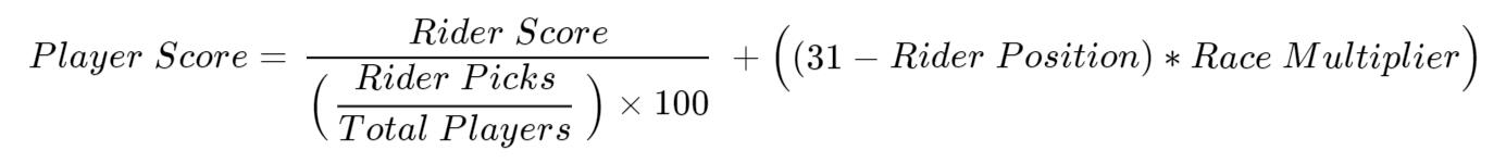 Scores are calculated by dividing the number of points a rider earned by the percentage of the users who picked them. A bonus is awarded for rare picks.